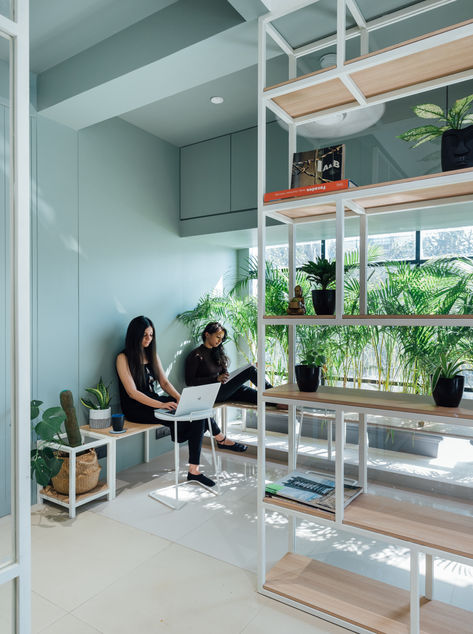 Located at the top level of a commercial building, this compact facility needed to accommodate an international career guidance institute with a variety of spaces and functions. The site is flooded with the irregular placement of structural members with varying sizes warned us to ‘mind the grid’. The ‘de Stijl art movement came to the rescue, where they tried to establish, a visual harmony between unevenly placed lines within the framed network and further balancing them with colors. We undertook a similar exercise where the complex structural grid becomes the framed network and further balanced them with the zones achieved earlier based on privacy and occupancy, resulting in multiple iterations. These iterations were then investigated based on light quality and ease of space to achieve an ideal workspace. A series of custom-designed partitions were introduced to distinguish spaces and functions along with layers of greens within spaces to perform efficiently and in collective synergy.
